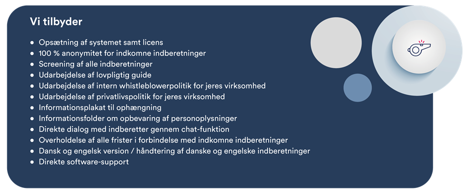 Vores whistleblowerordning sikrer, at jeres virksomhed lever op til de nye lovkrav om at etablere en whistleblowerordning. Vores whistleblowerordning giver adgang til samtlige lovpligtige funktioner og indberetninger og håndteres sikkert og effektivt af vores advokater.